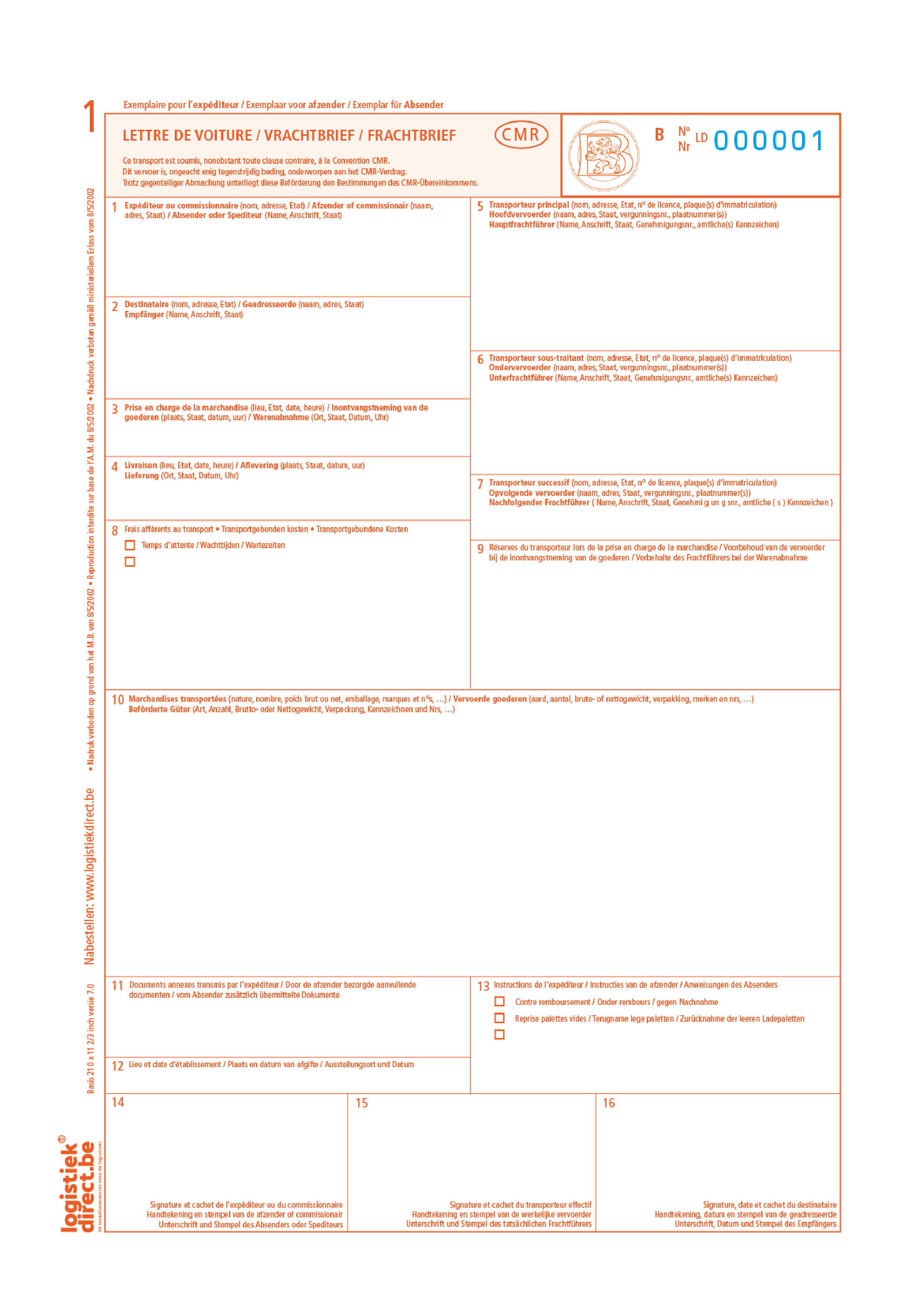 Les lettres de voiture CMR destinées au marché belge ne peuvent être émises que par des organisations professionnelles et par des éditeurs agréés par le SPF Finances. L'Etat belge nous a accordé une licence d'imprimeur agréé pour les lettres de voiture CMR. Les CMR portent le sceau de l'Etat.