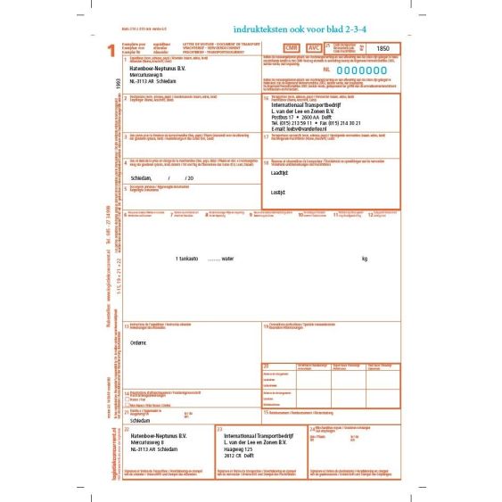 Cette lettre de voiture CMR à 4 volets est conçue comme un combiné, ce qui la rend idéale pour une utilisation dans la cabine du camion ou au bureau d'expédition. La lettre de voiture CMR se présente en 4 volets, dans l'ordre des feuilles 1,2,3,4. Le papier est autocollant et de format A4. Les liasses sont collées à l'envers, avec un format total de 210x310mm. Cette lettre de voiture CMR est particulièrement adaptée à une utilisation manuelle, mais peut également être utilisée dans une imprimante matricielle à plat. Le recto est formaté en néerlandais, allemand et français. Au verso, outre la référence aux conditions générales, on trouve également la traduction des cases à remplir et la référence aux conditions générales en anglais, en italien et en espagnol.