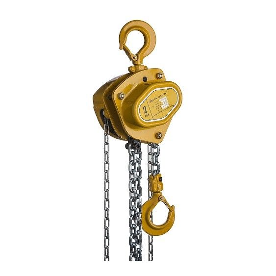 Palan manuel à chaîne Jaune de la marque Delta. Un palan manuel à chaîne est un appareil de levage qui est mis en mouvement par la force musculaire pour soulever/déplacer des charges. Le palan manuel à chaîne Delta Yellow est conçu pour une utilisation normale.